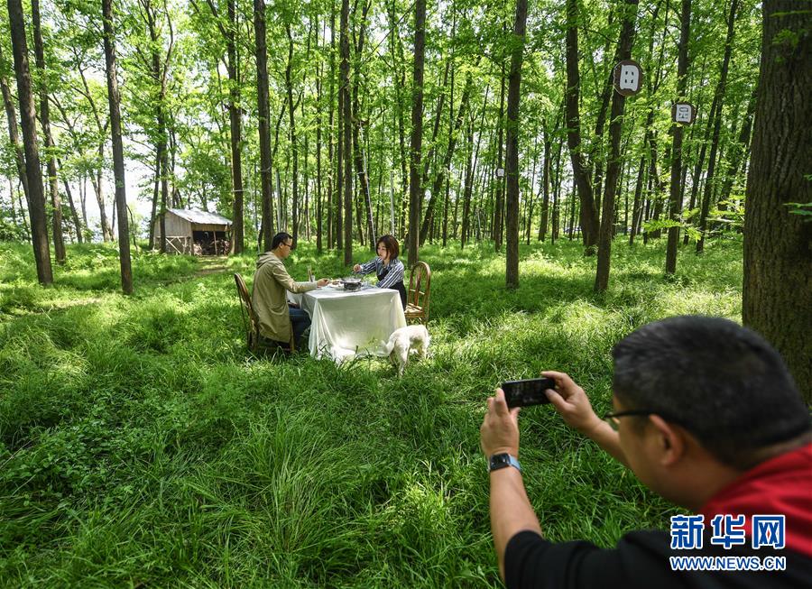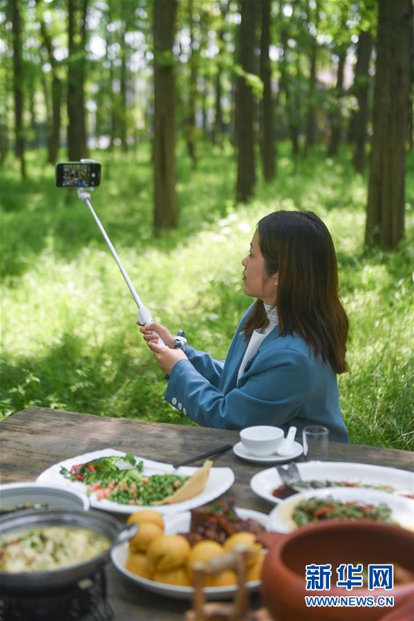 4月15日,工作人员在新沙岛树林中的田园餐桌品尝山乡美食,并通过手机直播平台进行“云直播”。 新华社记者徐昱摄