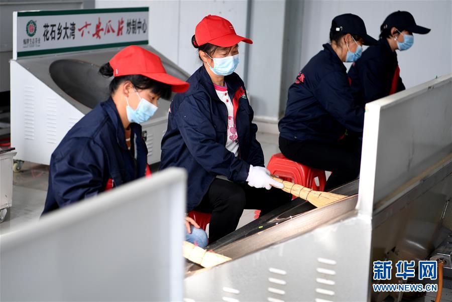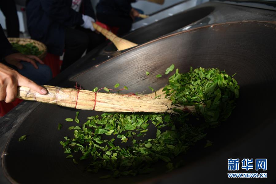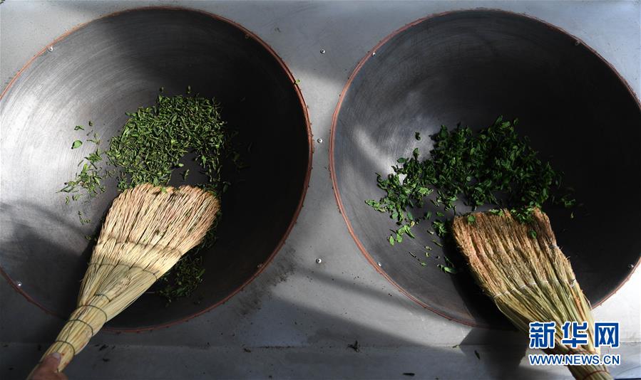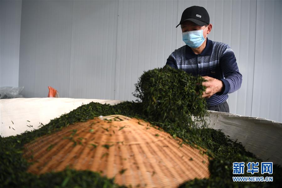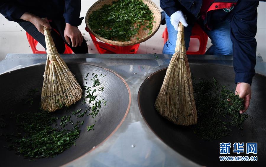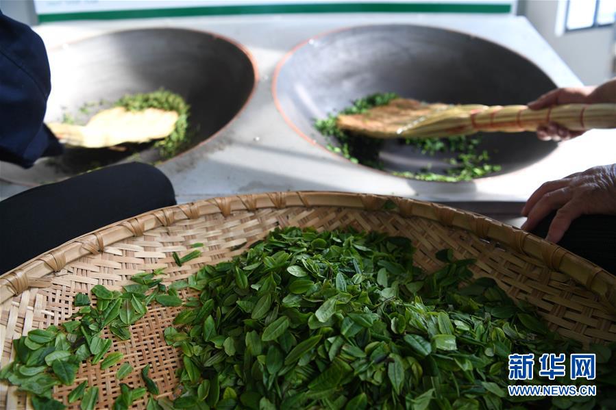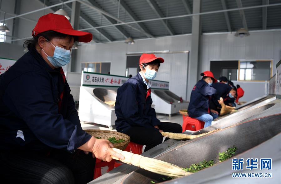 4月16日,大湾村村民在金寨县花石乡茶产业扶贫车间里加工茶叶。新华社记者刘军喜摄