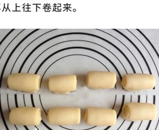 3.取一个酥皮擀成牛舌状,由下往上卷起来,盖上保鲜膜,静置一会。