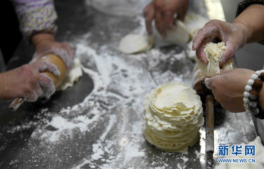 4月23日,在石家庄市正定县南仓口王家烧麦馆,工人在擀制烧麦皮。 “烧麦”是一种加馅蒸熟的面食。河北石家庄正定王家烧麦以白面、牛肉、羊肉为原料,加上祖传秘制调料和香油等,经过和面、擀皮、选材、剁馅、拌馅、蒸制等工序制作而成。2011年,正定王家烧麦被列入石家庄市级非物质文化遗产名录。 新华社发(陈其保 摄)