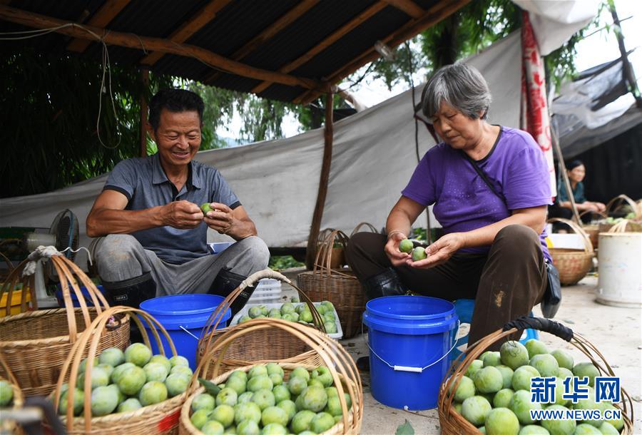 7月2日,巫山县曲尺乡权发村村民王恩海和妻子陈珍清在挑拣脆李。新华社记者 王全超 摄