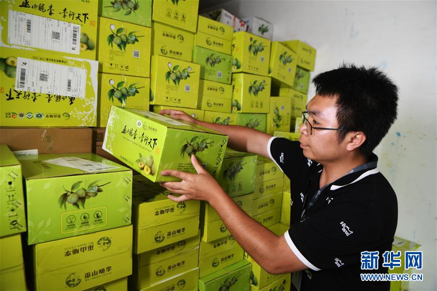 7月2日,物流公司工作人员在巫山县曲尺乡搬运即将发货的脆李。新华社记者 王全超 摄