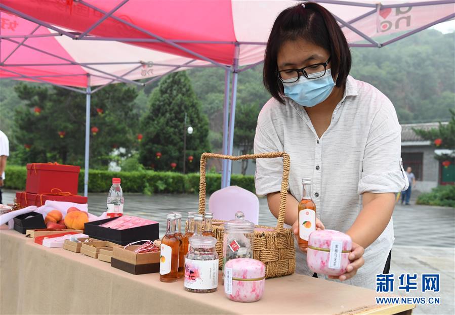 7月11日,在刘家店镇第五届丫髻山“蟠桃会”活动现场,工作人员在展示大桃文创产品。 当日,在做好新冠肺炎疫情防控的前提下,北京平谷区刘家店镇第五届丫髻山“蟠桃会”在丫髻山太极广场举行。本次活动设有“甜桃王”擂台赛、大桃文创产品展示、网上直播销售大桃等环节。 新华社记者 任超 摄