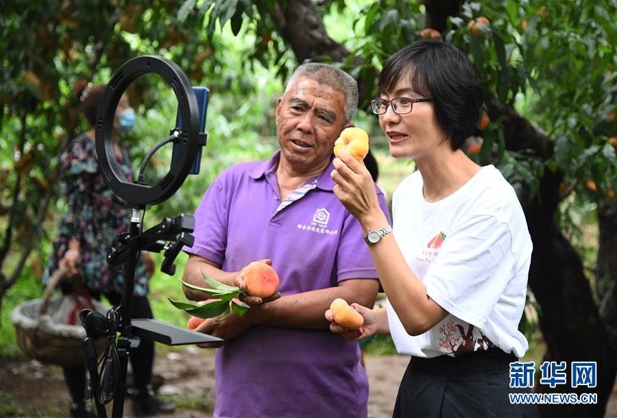 7月11日,在位于北京平谷区刘家店镇行宫村的一处桃园,果农通过网上直播的方式销售蟠桃。 当日,在做好新冠肺炎疫情防控的前提下,北京平谷区刘家店镇第五届丫髻山“蟠桃会”在丫髻山太极广场举行。本次活动设有“甜桃王”擂台赛、大桃文创产品展示、网上直播销售大桃等环节。 新华社记者 任超 摄