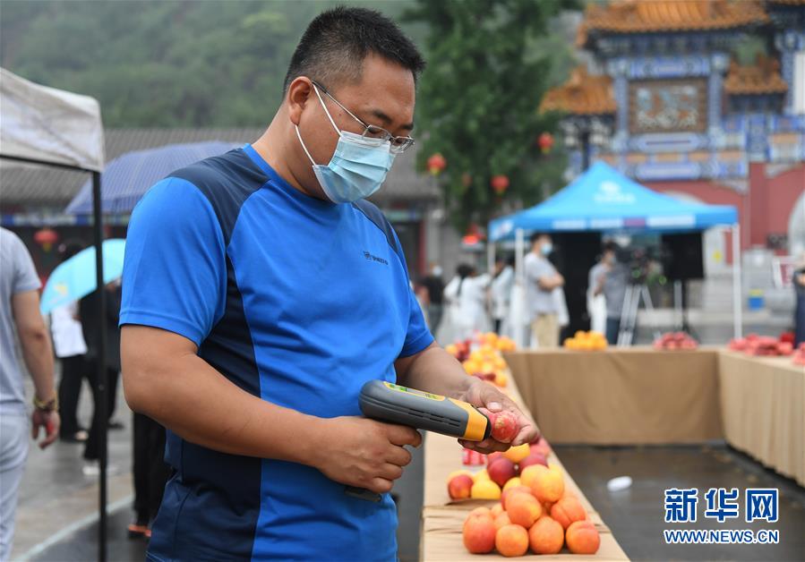 7月11日,在刘家店镇第五届丫髻山“蟠桃会”活动现场,工作人员测量参加“甜桃王”擂台赛大桃的含糖度。 当日,在做好新冠肺炎疫情防控的前提下,北京平谷区刘家店镇第五届丫髻山“蟠桃会”在丫髻山太极广场举行。本次活动设有“甜桃王”擂台赛、大桃文创产品展示、网上直播销售大桃等环节。 新华社记者 任超 摄