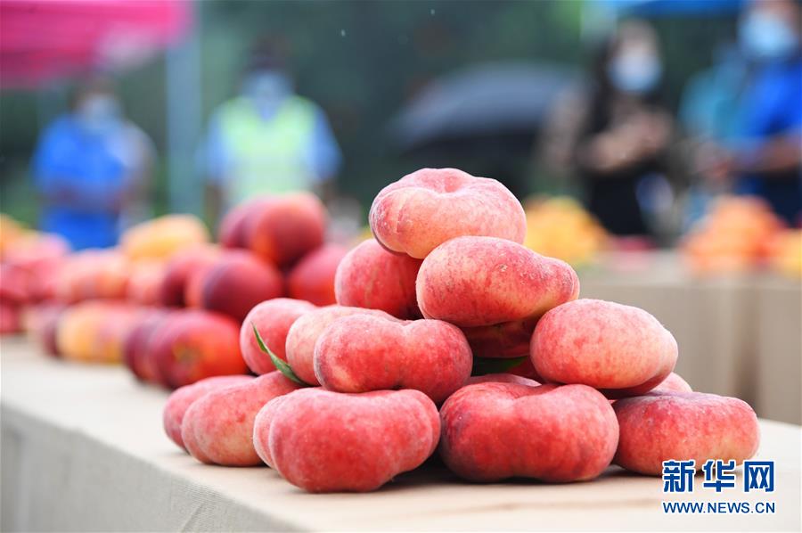 这是7月11日在刘家店镇第五届丫髻山“蟠桃会”活动现场拍摄的蟠桃。 当日,在做好新冠肺炎疫情防控的前提下,北京平谷区刘家店镇第五届丫髻山“蟠桃会”在丫髻山太极广场举行。本次活动设有“甜桃王”擂台赛、大桃文创产品展示、网上直播销售大桃等环节。 新华社记者 任超 摄