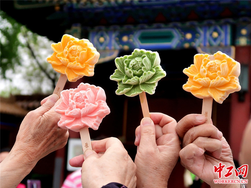 2019年4月24日,北京,景山公园首次推出“景山牡丹纪念版”北冰洋汽水,与园内正热销的“牡丹冰激凌”一起,成为市民游客赏花游园的“新宠”。(图片来源:视觉中国)
