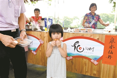 “仙岗仙丹,一看就不简单!”村民杨碧芳摆出的丹灶特色美食“仙丹”茶旦仔非常受欢迎,“我要一盒!”“我也要一盒带回家!”当日凌晨2点,杨碧芳就起床做茶旦仔,她一个人做了整整6盆,而10点不到就只剩两盆了。她告诉记者,茶旦仔是用番薯和糯米粉做的,馅料则用糖来做。茶旦仔好吃还有一个秘诀,那就是使用仙岗的蟹眼泉水。作为本地人,杨碧芳直言:“我们的泉水煲茶都要好喝点!”