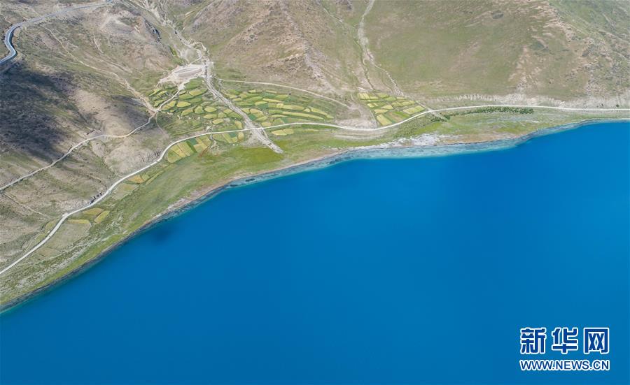 这是8月31日拍摄的羊卓雍错湖边的农田(无人机照片)。 羊卓雍错简称羊湖,位于西藏山南市浪卡子县境内,湖面海拔4400多米。时值夏末秋初,羊湖风景醉人。 新华社记者 孙非 摄