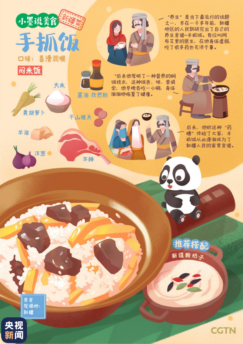 后来,他把这种“药膳”传给了大家,便成为现在的维吾尔族人普遍吃的抓饭了。