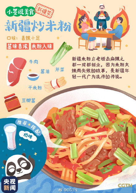 对于新疆的年轻人来说,一碗新疆炒米粉,是“不知道吃啥”和“随便”的终极答案。炒米粉源中国南方,1982年传入新疆,在根据当地人口味改良后,一半碗辣酱和一半碗粗粉成为新疆炒米粉独特的标签。因此,吃过新疆炒米粉的人都不能忘记一个感觉,那就是辣。