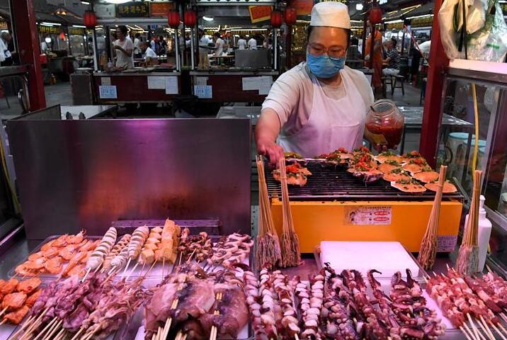 这是6月2日拍摄的河南省开封市鼓楼夜市。 近日,河南省开封市鼓楼夜市在关闭4个月后恢复开放。近200个摊位整齐排开6月2日,在河南省开封市鼓楼夜市,一名小吃摊主在制作传统小吃炒凉粉。