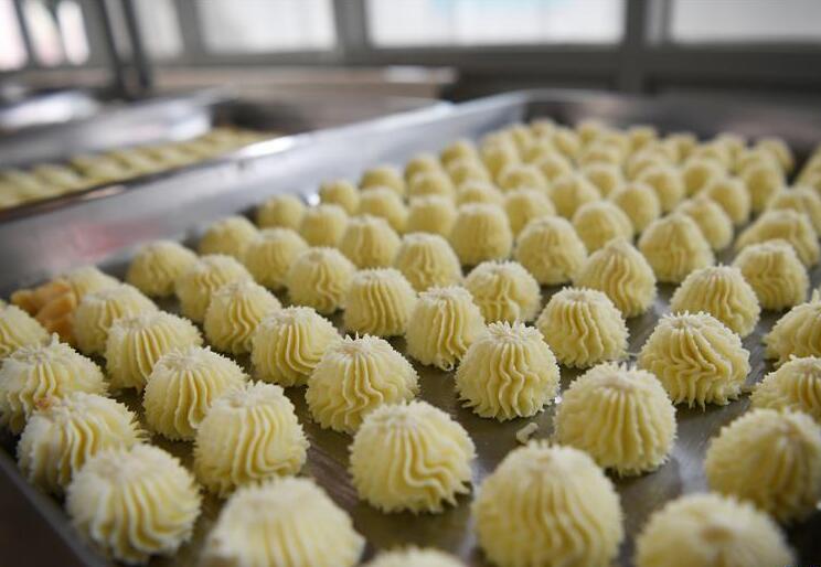 在新疆昭苏县喀拉苏镇阿克萨依村穆英台畜产品加工农民专业合作社,员工在车间内忙碌,制作当地一种传统食品奶疙瘩。做奶疙瘩时,先将鲜奶发酵,再把发酵后的酸奶倒入锅里熬制,然后装入布袋里吊起沥干水分,用手捏成小块,最后再将其晾干。
