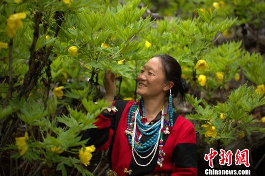 身着民族服饰的珞巴族姑娘赏黄牡丹。资料图 米林县供图