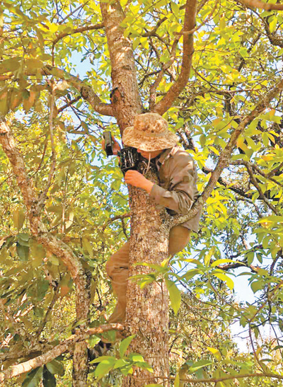 中国科学院昆明动物研究所研究人员在安放红外相机,进行鸟类监测。中国科学院昆明动物研究所鸟类学组供图