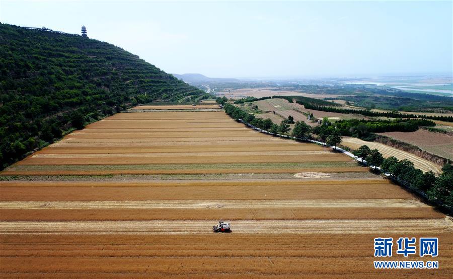 5月24日,收割机在潼关县秦东镇西厫村收割小麦(无人机航拍)。新华社记者 刘潇摄