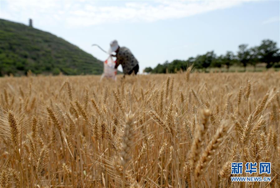 5月24日,在潼关县秦东镇西厫村,一位村民在自家麦地里收割机器未能收尽的小麦。新华社记者 刘潇摄