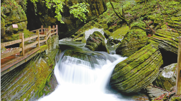 在化龙山间,岚河穿山越岭,曲折回环。在平坦处静如处子,它像一面镜子映照岸边似锦的繁花;在绝壁处,它如蛟龙一般吟唱出雄浑与壮阔。