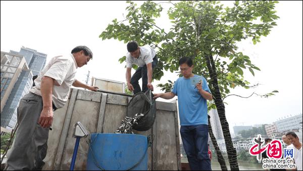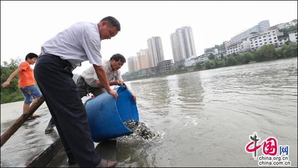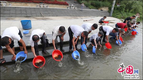 中国网6月24日讯 6月23日,人们在贵州省玉屏侗族自治县舞阳河畔放流鱼苗。