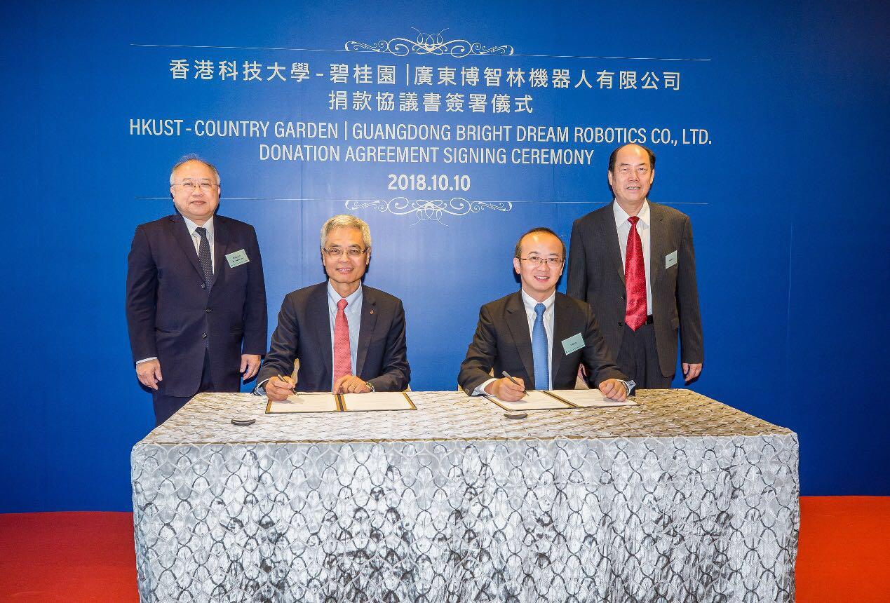 香港科技大学校长史维教授(左二)、碧桂园集团副总裁兼广东博智林机器人有限公司总裁沈岗先生(右二)签署捐款协议