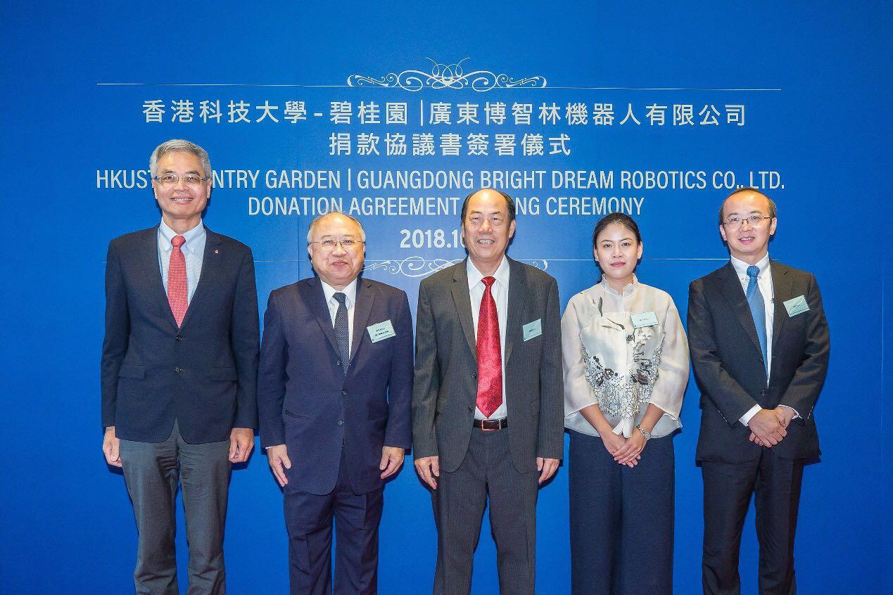 (左起)港科大校长史维教授、港科大校董会主席廖长城先生、碧桂园集团董事会主席杨国强先生、碧桂园集团执行董事杨子莹女士、碧桂园集团副总裁兼广东博智林机器人有限公司总裁沈岗先生出席捐款协议书签署仪式