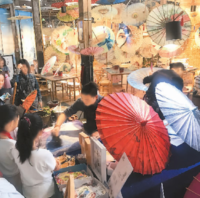手工艺活态馆内,游客在围观传统的制伞工艺。