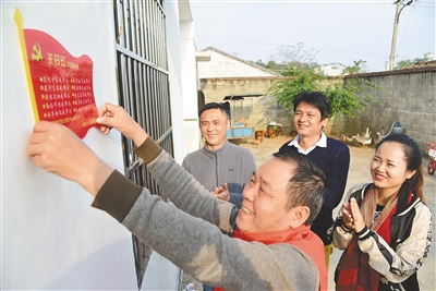 今年1月,澄迈县大丰镇才存社区“红色家庭”党员代表王日江正在自家门前悬挂“光荣牌”。 通讯员 李健 摄