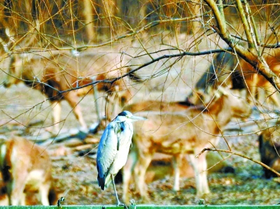 一只苍鹭神态放松地站立着,不远处就是成群的麋鹿。