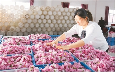 近年来,江苏省海安市城东镇壮志街道积极引导农民进行种植业结构调整,发展玫瑰花种植及深加工为主的休闲观光农业,通过农旅结合,玫瑰花远销全国各地,成为当地农民致富的“芬芳之路”。图为5月5日,壮志街道石庄村农民在整理待售玫瑰花。