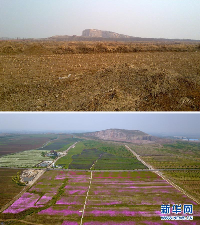 拼版照片:上图为齐鲁酒地文化创意产业园生态治理前原貌(资料片);下图为现在的齐鲁酒地文化创意产业园(5月11日新华社记者郭绪雷无人机拍摄)。 山东省安丘市经济开发区青龙山片区原是废弃采石坑,山体破坏严重,生态环境脆弱,2012年规划建设齐鲁酒地文化创意产业园。经过7年的努力,目前已建成集“文化创意、旅游体验、健康养生、运动休闲、教育培训”五大主题功能区于一体的文旅休闲养生区,将采石坑变废为宝、还绿于山。 新华社发