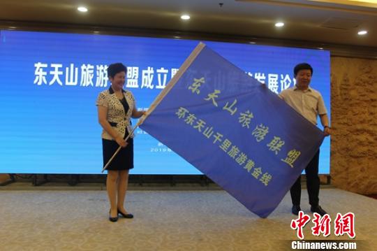 7日,新疆“东天山旅游联盟”成立,新疆维吾尔自治区文化旅游厅副巡视员马睿(右)为东天山旅游联盟首年轮值城市——哈密市授旗。 陶拴科 摄