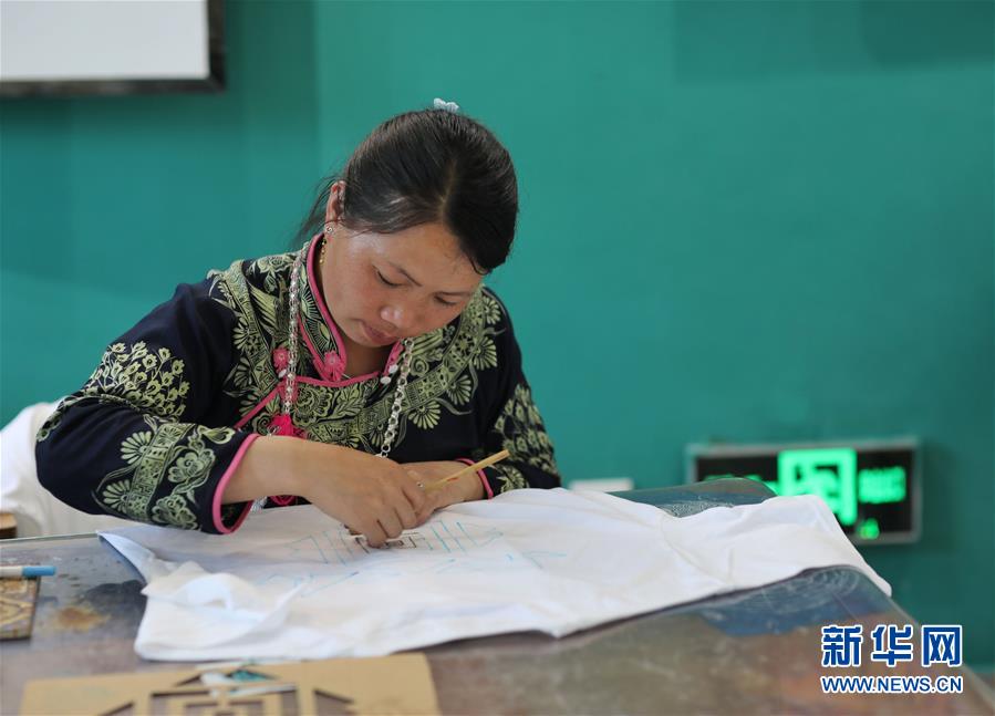 7月2日,苗族妇女王尖其在丹寨万达小镇展示苗族蜡染技艺。 2017年7月,贵州省丹寨县的丹寨万达小镇对外开放。两年来,丹寨万达小镇游客接待量持续增长,为700余名贫困户提供就业岗位,有力助推了丹寨县的脱贫攻坚工作。 新华社记者 欧东衢 摄