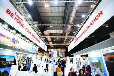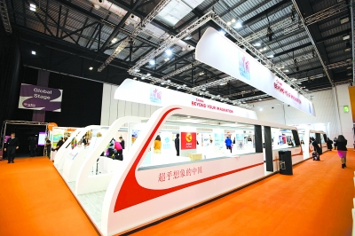 世界旅游交易会始于1980年,是目前全球规模最大、专业水准最高的旅游产业顶级盛会。今年伦敦世界旅游交易会仍以世界各国展区和研讨会为主要交流平台。其中,中国展区的主标题为“超乎想象的中国”,场地面积304平方米。根据狭长的场地形状,展区设计成两节高铁车厢,并以40组车座构成40个展位,为业内洽谈创造了别致空间,各地景观海报利用车窗效果进行展示。狭长车厢的一端是主背景墙,嵌有大屏幕,也设计成一节车厢的外观,人们在面对它的时候,会有在高铁站台等候、面对一辆待发列车之感。海伦·瓦特丽高度评价中国展区的高铁造型设计,认为这是今年世界旅游交易会的一项重要成就。