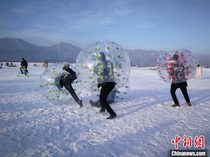 雪中气泡“比武”,看谁有劲,游客雪中忙“摔跤”。 王小军 摄