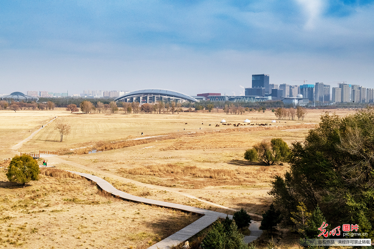 赛汗塔拉城中草原位于内蒙古包头市中心地带,于5个城区之间,地理位置十分优越。园区海拔1034至1058米,占地面积约712公顷(10680亩),是包头市区原始草原湿地生态系统。园内环路总长10公里,主要景点有敖包广场、观景台、育苗基地、草原风光区、红柳林、四道沙河水系及戏鹿亭等。园内拥有各类植被及乔灌木,林草中还栖息着山鸡、野兔、野鸭等多种野生动物。园区拥有着近1万亩的天然植被。图为2020年10月24日,秋染赛汗塔拉。(杜萍摄/光明图片)