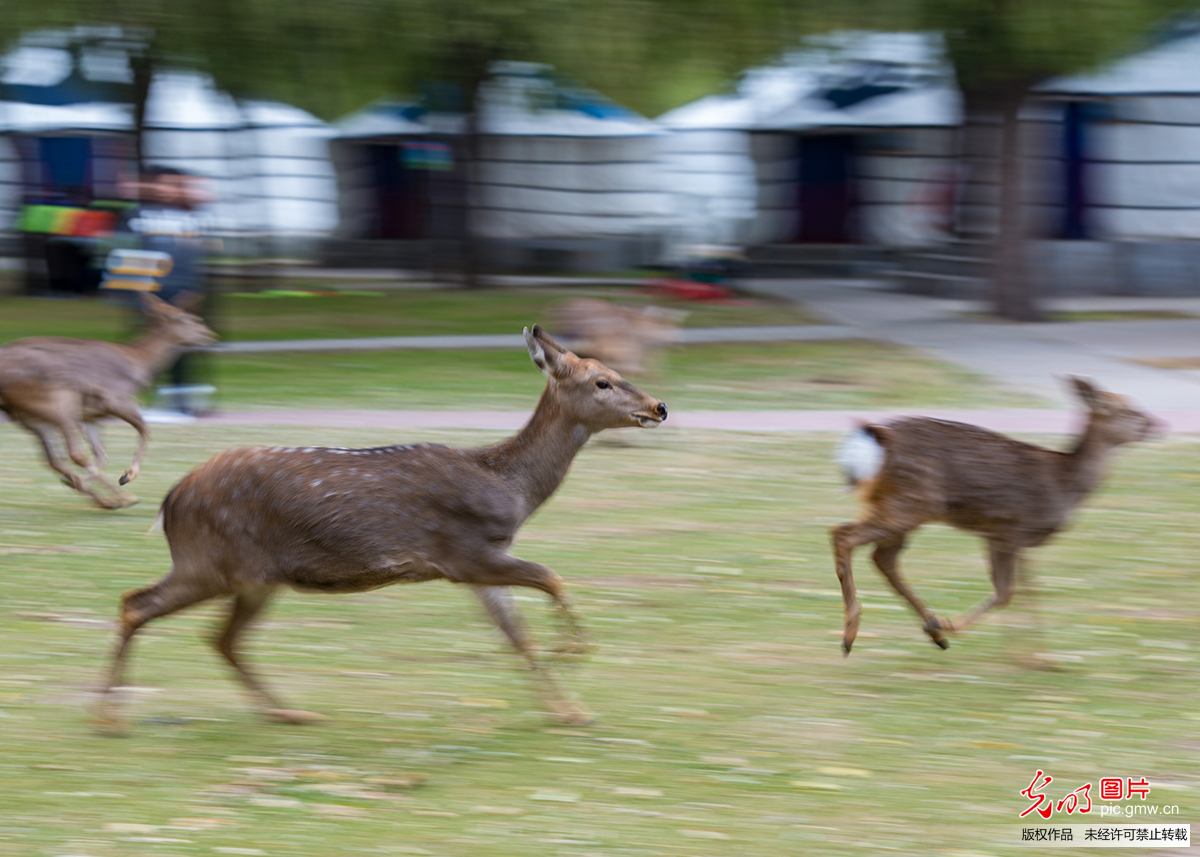 2020年10月24日,欢快的梅花鹿尽情的奔跑。(杜萍摄/光明图片)