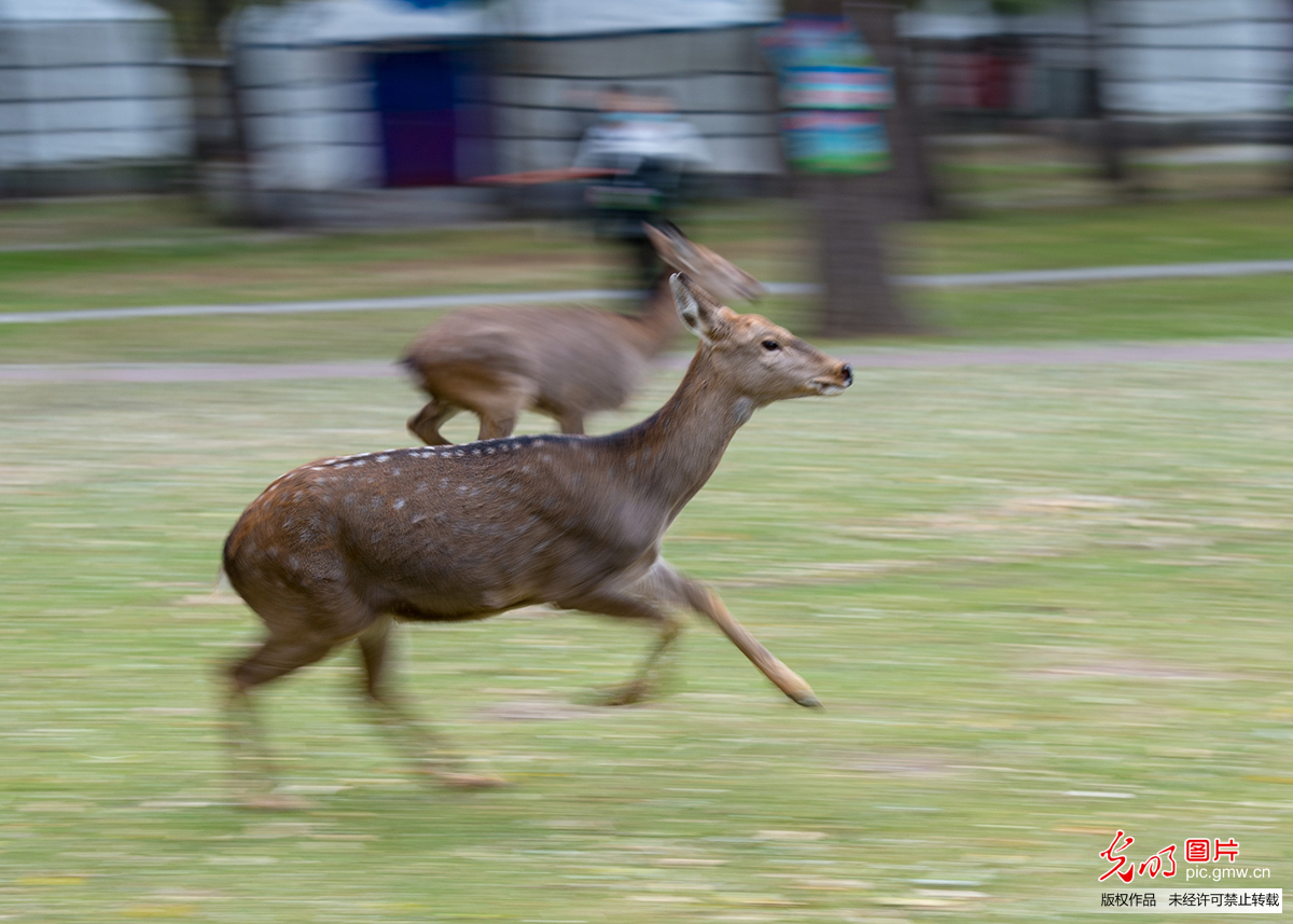 2020年10月24日,欢快的梅花鹿尽情的奔跑。(杜萍摄/光明图片)