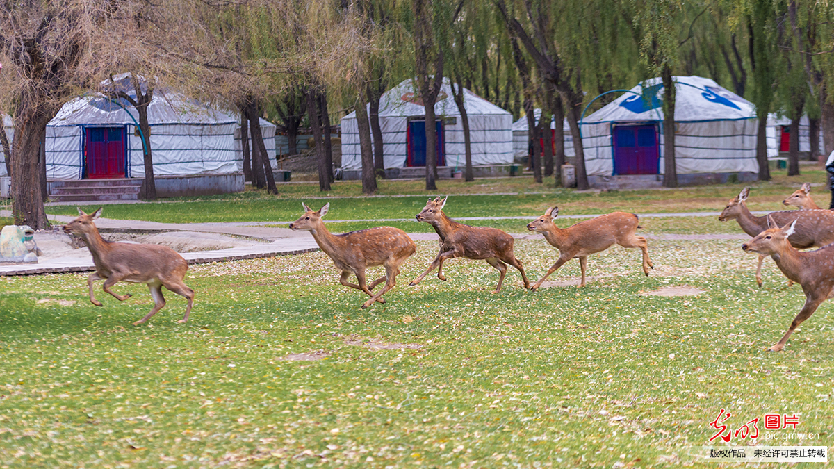 2020年10月24日,欢快的梅花鹿尽情的奔跑。(杜萍摄/光明图片)