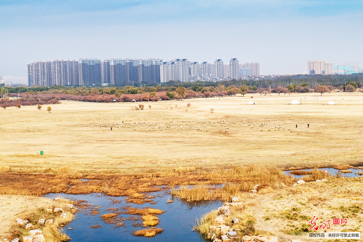 赛汗塔拉城中草原位于内蒙古包头市中心地带,于5个城区之间,地理位置十分优越。园区海拔1034至1058米,占地面积约712公顷(10680亩),是包头市区原始草原湿地生态系统。园内环路总长10公里,主要景点有敖包广场、观景台、育苗基地、草原风光区、红柳林、四道沙河水系及戏鹿亭等。园内拥有各类植被及乔灌木,林草中还栖息着山鸡、野兔、野鸭等多种野生动物。园区拥有着近1万亩的天然植被。图为2020年10月24日,秋染赛汗塔拉。(杜萍摄/光明图片)