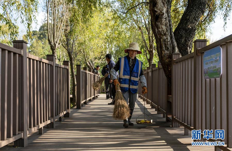 11月9日,工人在打扫洱海边的栈道。新华社发(陈欣波 摄)