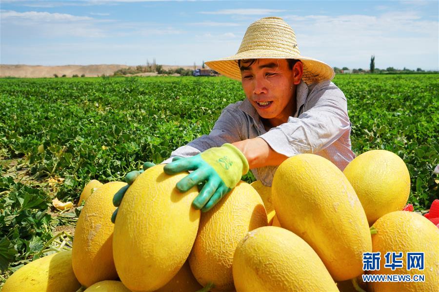连日来,新疆哈密市伊州区南湖乡的万余亩哈密瓜陆续成熟上市,吸引众多客商前来订购。 新华社发(李华 摄)