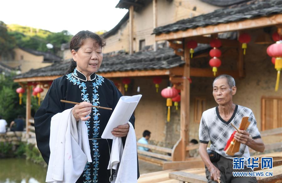 6月26日,屏南县甘棠乡漈下村的四平戏表演者韦忠珠(左)和国家级非物质文化遗产传承人陈大并在表演四平戏。新华社记者林善传摄