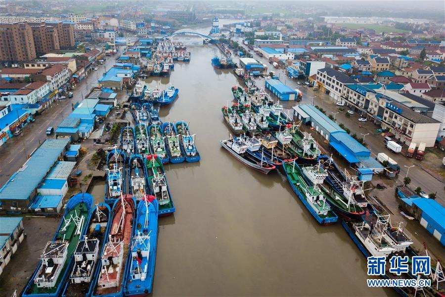 7月22日下午,在江苏省启东市吕四港,大批渔船回港避风(无人机拍摄)。今年第10号台风“安比”当日12时30分在上海崇明岛登陆后,于下午过境江苏省启东市,导致当地出现暴雨、大风等极端天气。 新华社记者 李响 摄