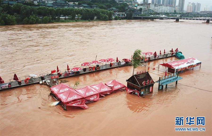 河水已将黄河兰州索道码头浸没(7月23日无人机拍摄)。