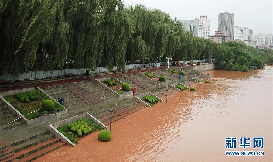 被水浸没的黄河兰州段亲水平台已经封闭(7月23日无人机拍摄)。 新华社记者 陈斌 摄