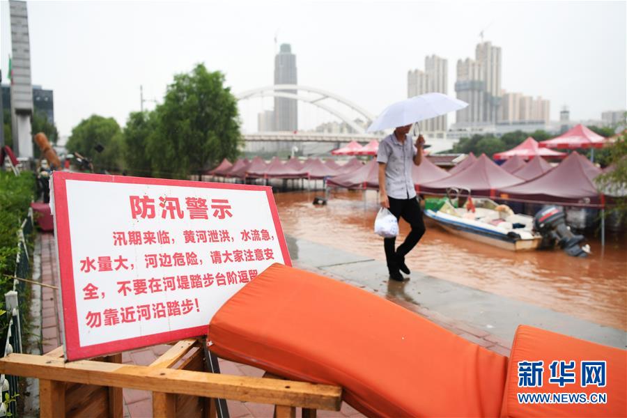 7月23日,在兰州市体育公园黄河岸边,防汛警示提示游客注意安全。 新华社记者 陈斌 摄