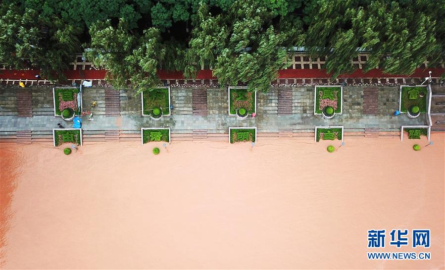 这是被水浸没已经封闭的黄河兰州段亲水平台(7月23日无人机拍摄)。 新华社记者 陈斌 摄
