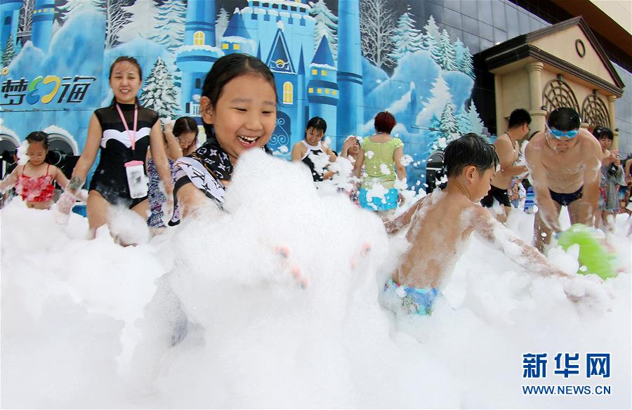 7月23日,人们在山东烟台一海水乐园内玩泡泡。 大暑时节,人们用各种方式消暑纳凉,乐享清爽夏日。 新华社发(唐克 摄)