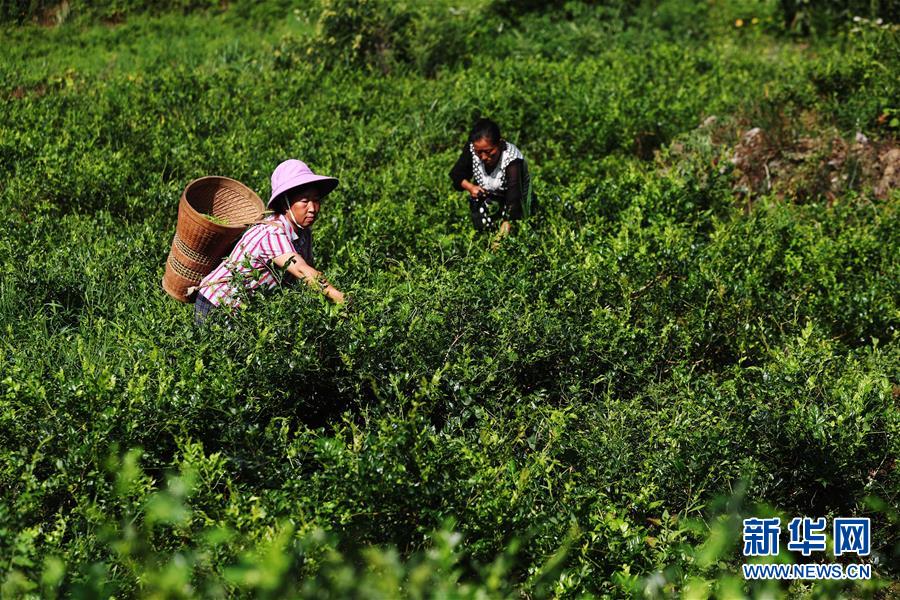 7月24日,村民在藤茶基地进行采摘。 近年来,重庆市黔江区邻鄂镇大力发展生态农业,把一种叫“显齿蛇葡萄”的植物的藤蔓茎叶加工成藤茶产品,作为促农增收的产业来发展。邻鄂镇通过土地流转建起了1000亩藤茶基地,每亩年产值可达8000多元,带动当地农民致富增收。 新华社发(杨敏 摄)