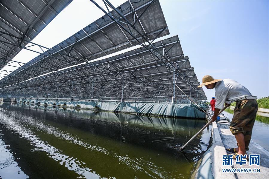 7月25日,在湖州市和孚镇陈塔村,养殖户清理光伏板下的鱼塘内的漂浮物。